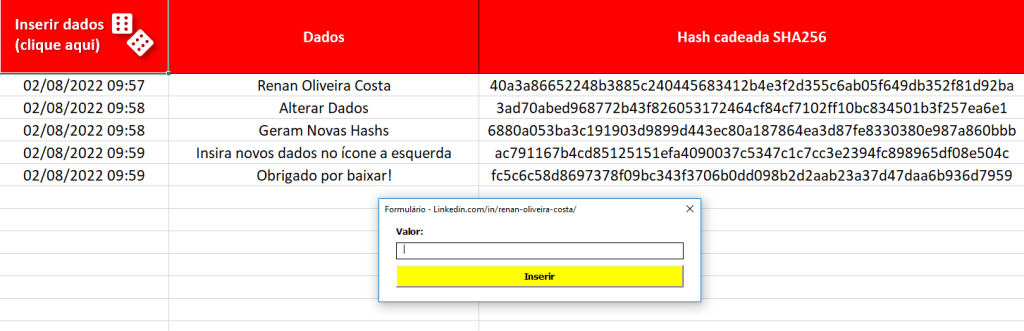 Segue uma aplicação do SHA256 para geração de hashs em cadeia para validação de dados em uma planilha qualquer.